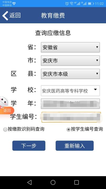 4、,查询应缴信息,选择按学生编号查询,如下图,输入省(安徽省)、市(安庆市)、区县(安庆市本级)、学校(安庆医药高等专科学校)、学年(2021年11月 )、学生编号(身份证号码),选择按学生编号方式缴费(学生本人身份证号码)点击下一步按钮即可查询到缴费信息