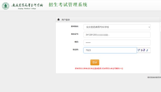 访问【安庆医药高等专科学校招生考试管理系统】,地址为:http://zsbm.aqyyz.cn/