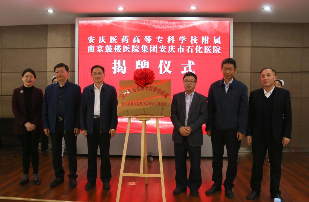 4月28日,南京鼓楼医院集团安庆石化医院(以下简称安庆石化医院)成为我校非直属附属医院挂牌仪式在安庆石化医院举行。安庆市人民政府副市长郭家满、安庆市大观区区长潘功发、安庆市卫健委党组书记、主任潘结标、安庆市医保局党组书记、局长余巧萍、南京鼓楼医院党委委员、副院长于成功、金陵药业股份有限公司总裁陈亚军、副总裁汪洋出席挂牌仪式。校长姚文兵、副校长朱庆丰、安庆石化医院董事长陈胜、党委书记王东波、院长韦宁华等一同参加签约及挂牌仪式。