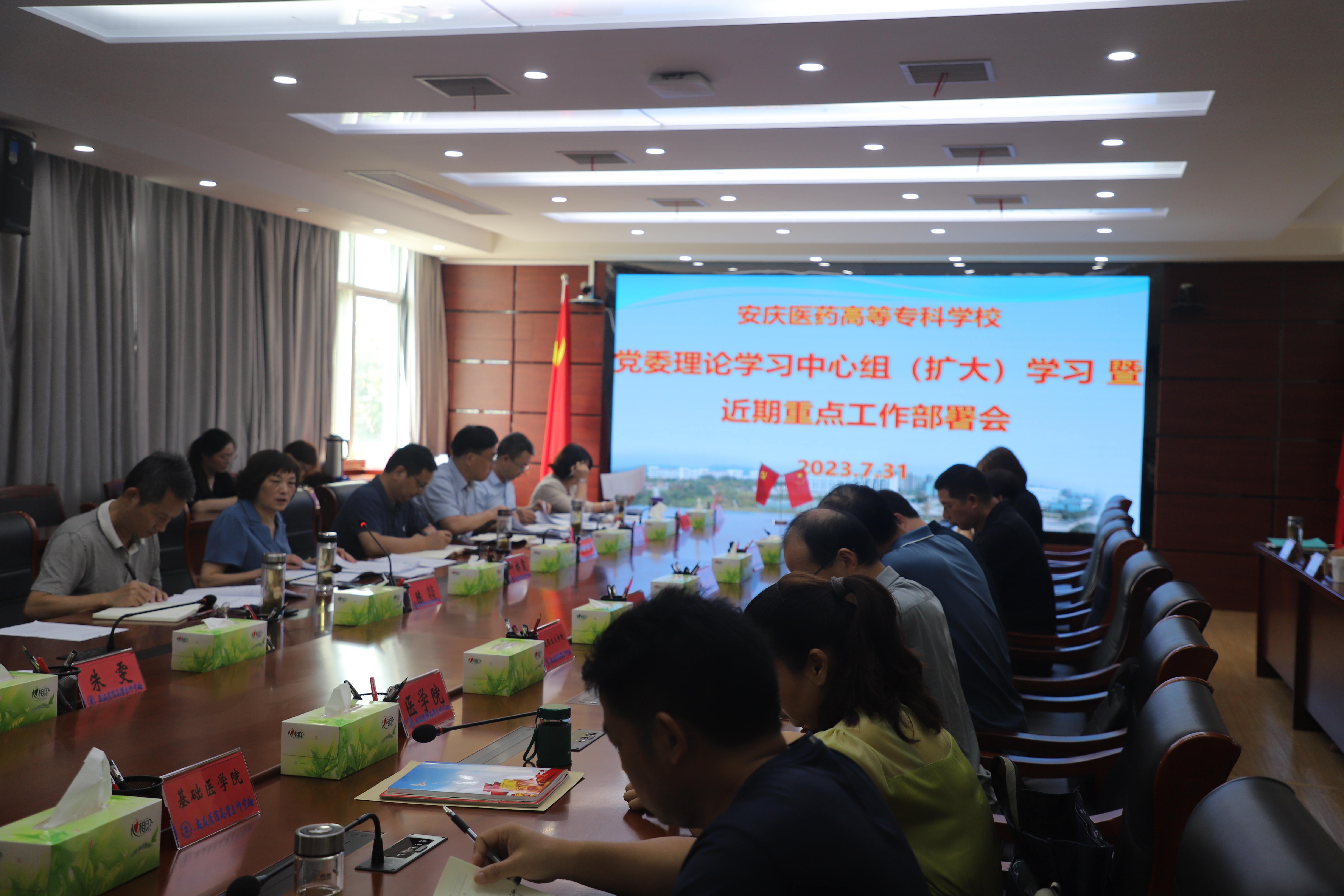 7月31日下午,我校在行政楼三楼会议室召开党委理论学习中心组(扩大)学习会,校党委书记叶林霞,党委副书记张仕庆,纪委书记陈燚,党委委员、副校长朱庆丰,党委委员朱三九、朱雯、陈琪、刘毅出席会议。会议由叶林霞主持。