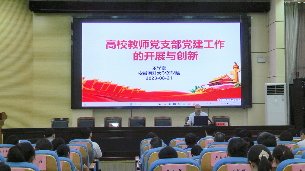 安徽医科大学药学院教工第三党支部书记王学富作题为“高校教师党支部建设工作的开展与创新”的专题讲座。他介绍了党支部的功能、党支部的建设、党建业务融合、样板支部的申报和建设,为我校教师党支部积极探索新时代党建与业务工作深度融合带来新思路、新经验。