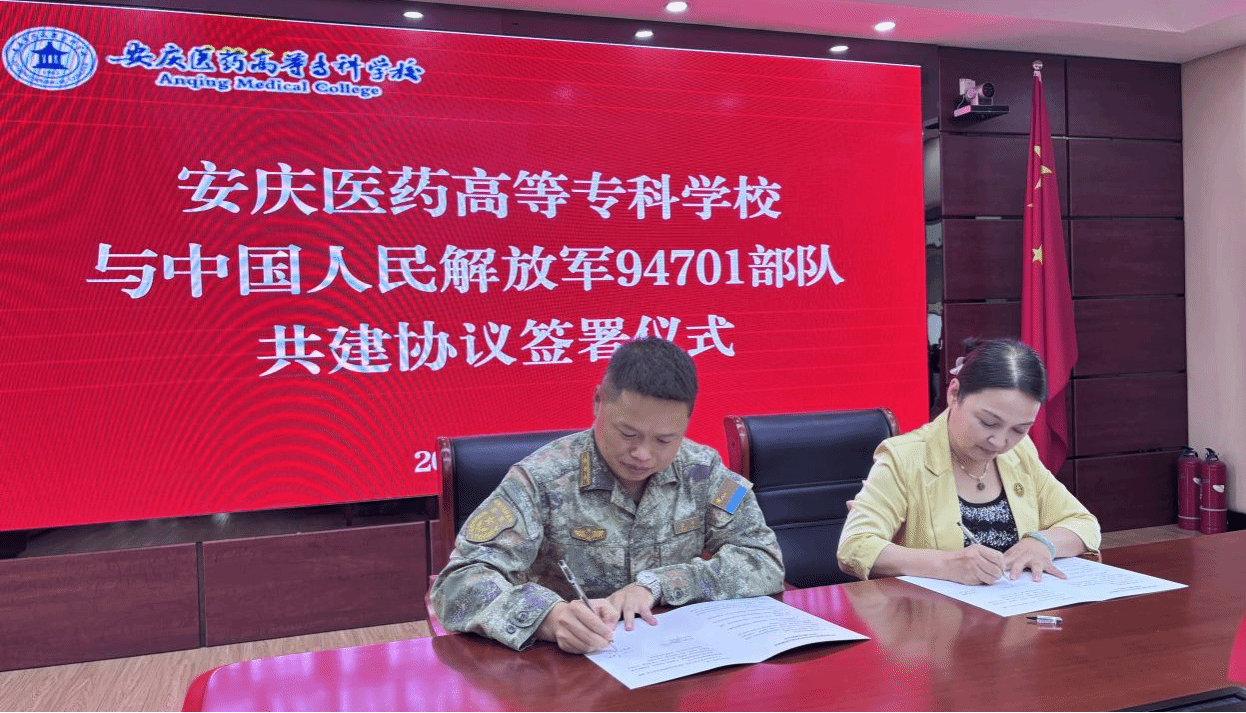 为深入学习贯彻习近平强军思想、落实军民融合发展战略,深化我校国防教育和人才培养工作,同时强化军校之间的互动交流,促进双方资源的共建与共享, 9月10日,安庆医药高等专科学校与中国人民解放军94701部队共建协议签署仪式在学校隆重举行。校党委副书记、校长朱庆丰,校党委委员、党政办主任陈琪,马克思主义学院、学生处、团委等部门负责人参加会议。