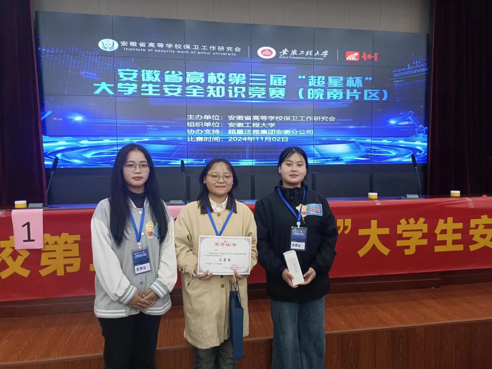 11月2日,安徽省高校第三届“超星杯”大学生安全知识竞赛(皖南片区)线下赛在安徽工程大学举行,现场30支参赛队伍80余名大学生同场竞技,我校代表队张月月、储忠钰、李湘湘3名选手默契合作、冷静答题,最终取得第三名。