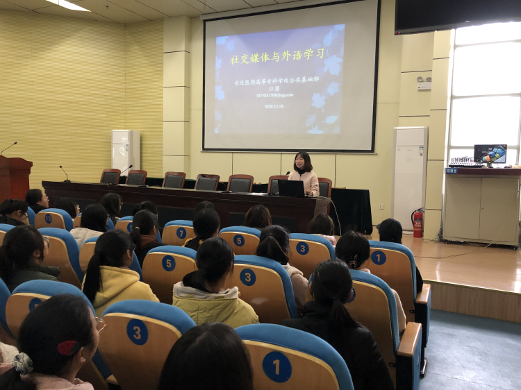 2020年12月10日中午12:30,在校图书馆学术报告厅,公共基础部语言教研室江慧老师做了题为《社交媒体与外语学习》学术讲座,百余名师生参加了此次讲座。