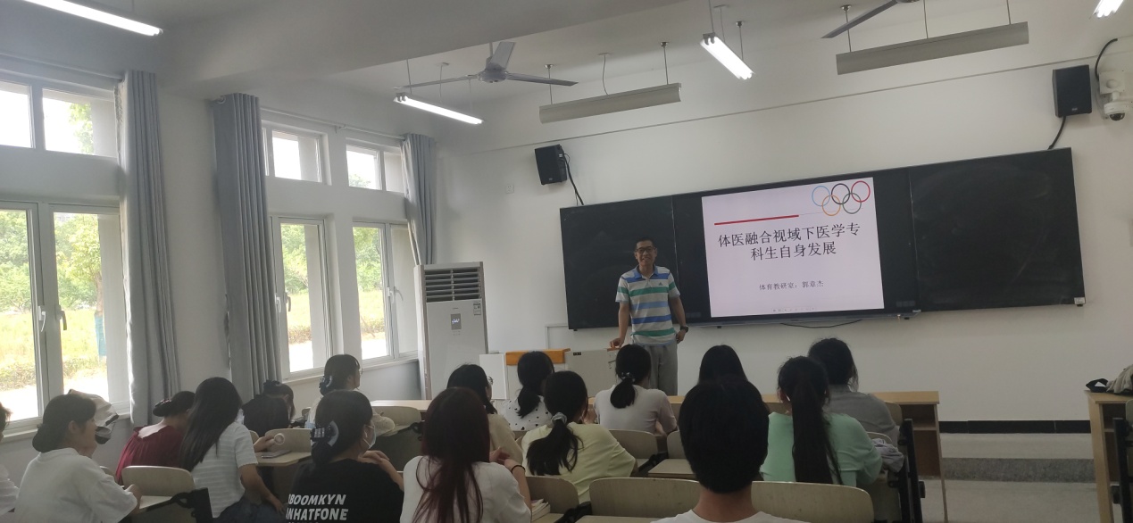 为了让医学院校的学生成为“体医融合”实践中的重要践行者,让学生了解健康的重要意义,通过自身发展,提升健康水平,2022年6月9日中午,公共基础学院郭章杰老师在教室为学生做了题为《体医融合视域下医学专科生自身发展》的学术讲座。