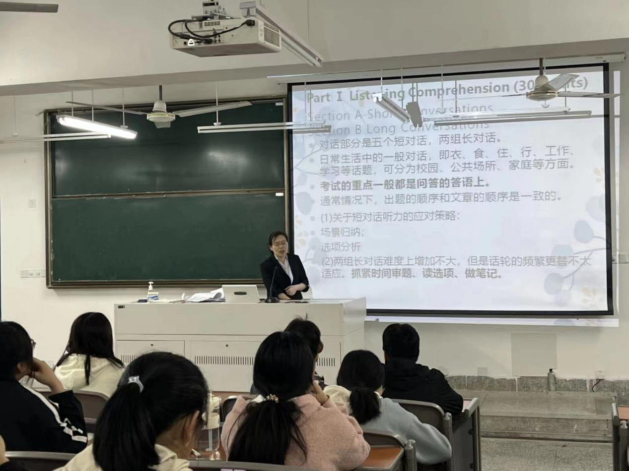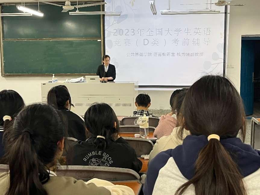 4月23日下午6:00,公共基础学院语言教研室钱秀娟老师在校第三阶梯教室作题为“2023年全国大学生英语竞赛(D类)初赛考前辅导”讲座,全体参赛学生参加。