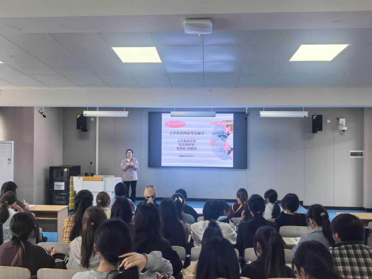 4月15日中午,语言教研室钱秀娟老师在第八阶梯教室为报名参加上半年大学英语四级考试的学生作考前辅导讲座,备考学子到场聆听。
