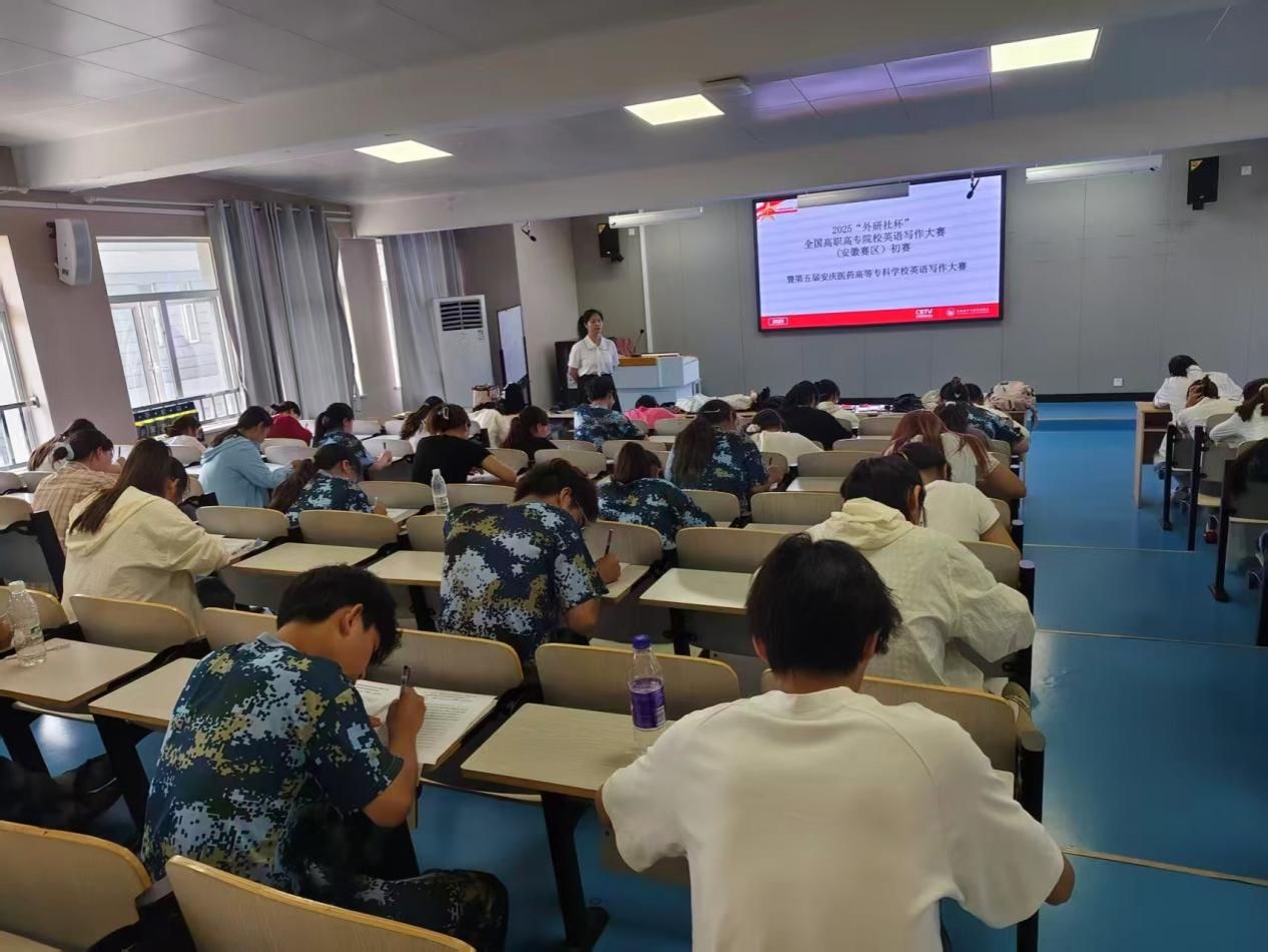 2025年9月17日,2025“外研社杯”职场英语挑战赛全国高职高专院校英语写作大赛(安徽赛区)初赛暨第五届安庆医药高等专科学校英语写作大赛在我校阶七、阶八教室顺利举行。自今年5月启动以来,赛事受到全校师生的广泛关注与积极响应,累计吸引100余名学生踊跃报名,充分展现了我校学生积极进取的学习风貌和浓厚的英语学习氛围。