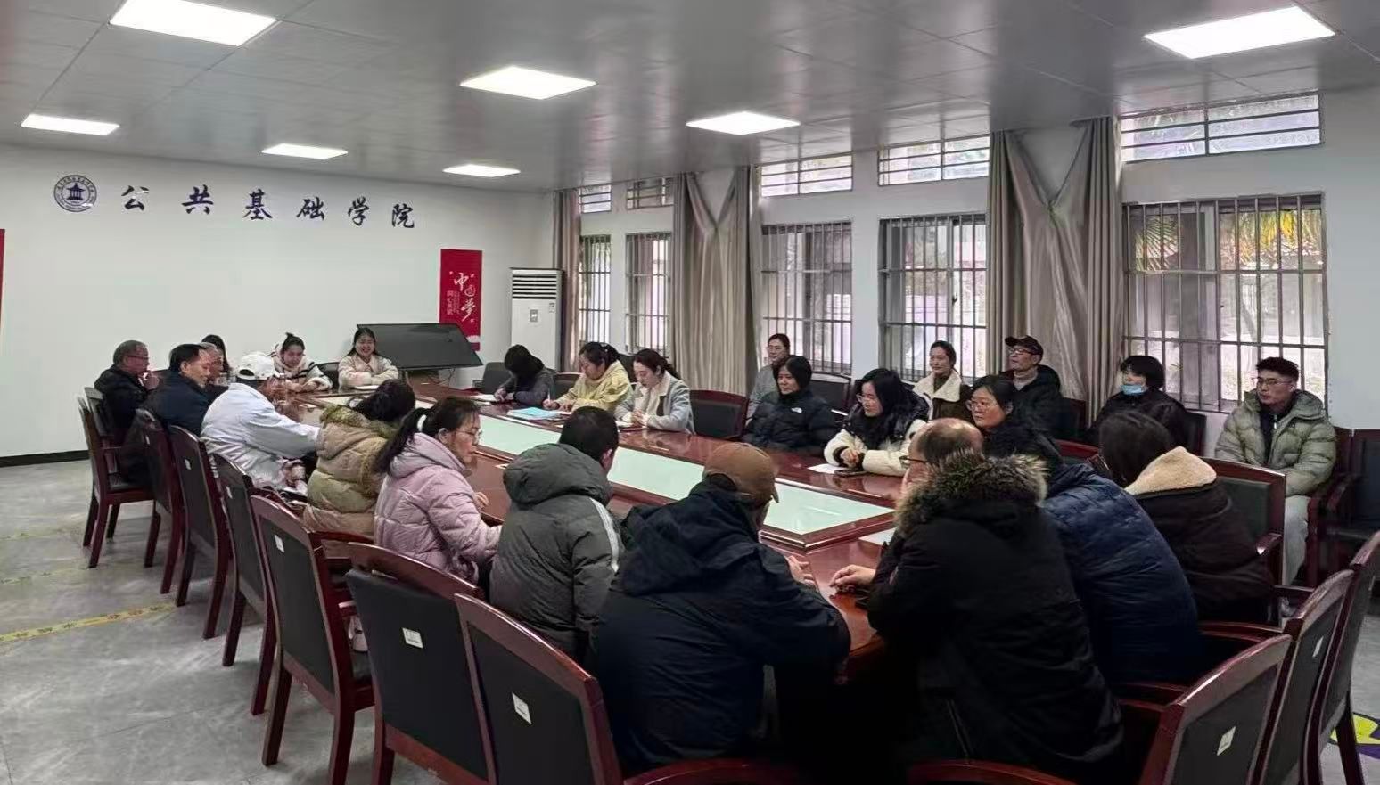 2026年3月4日,公共基础学院在1号教学楼1楼会议室召开师德师风专题会议暨新学期开学工作会议,学院全体教职工参会。