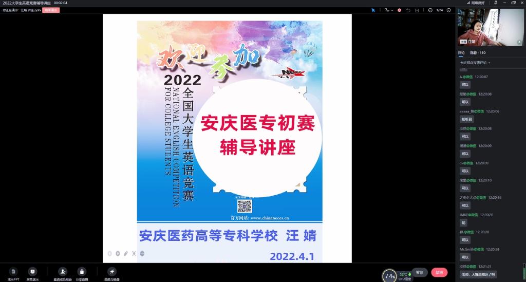 2022年4月1日,公共基础学院语言教研室的汪婧老师为今年我校报名参加全国大学生英语竞赛的300余名学生开展了一场赛前辅导线上直播专题讲座。