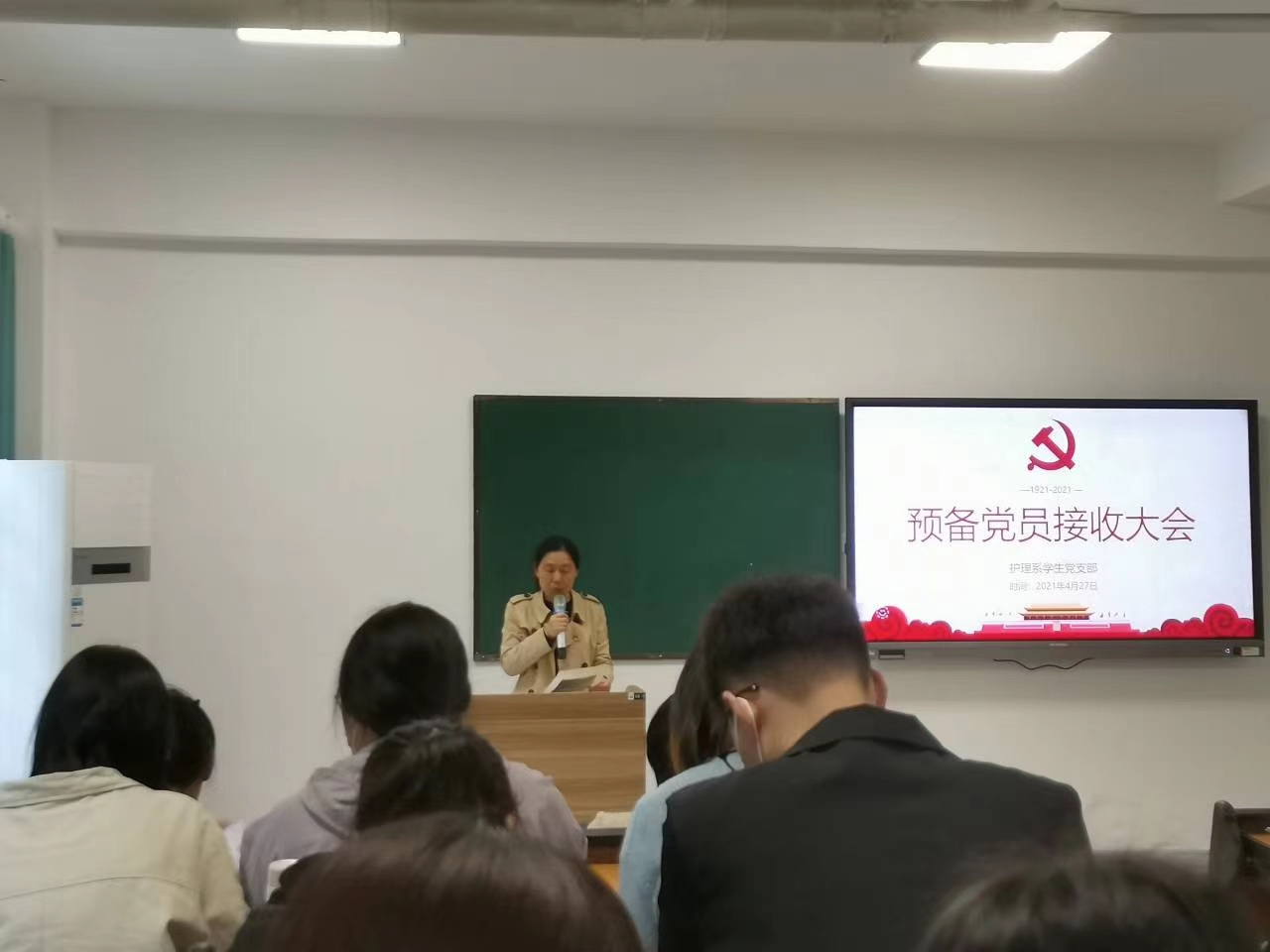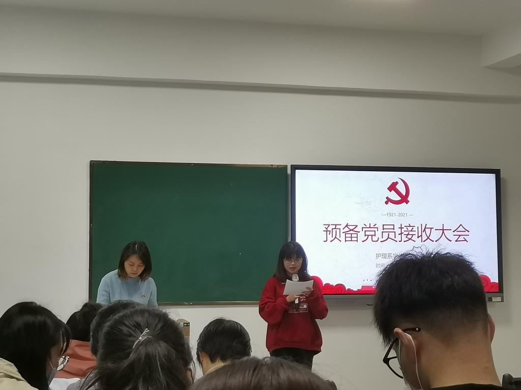 4月27日中午,护理系在实训楼一楼阶梯教室召开2019级学生预备党员接收大会。