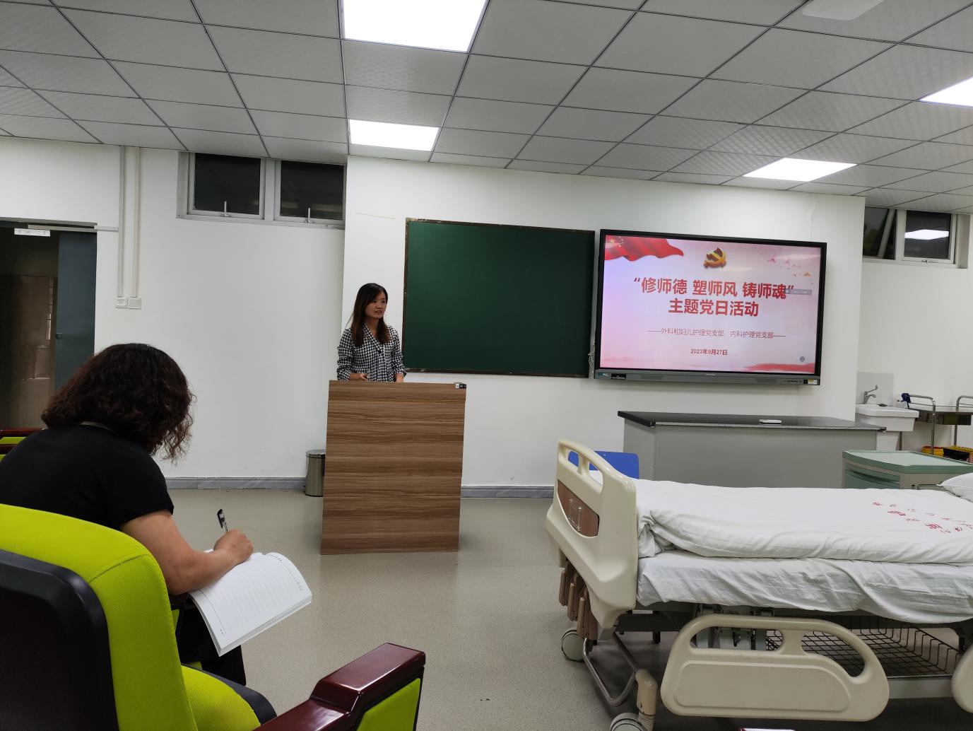 根据教育部学习贯彻习近平新时代中国特色社会主义思想主题教育工作要求,落实师德师风建设工作推进,2023年9月27日,护理学院外科护理和妇儿护理党支部与内科护理党支部联合开展“修师德、塑师风、铸师魂”主题党日活动,活动由外科护理和妇儿护理党支部书记刘晓蓓主持,全体党员及非党员老师参加。