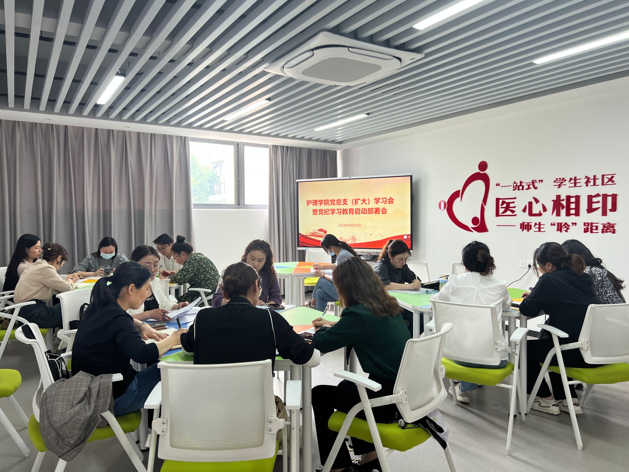 为进一步严明政治纪律,带动各项纪律全面从严,发挥纪律建设标本兼治作用,4月29日,护理学院党总支在杏林党建学生社区召开理论学习扩大会暨党纪学习教育启动会,护理学院党总支书记、院长钱立晶主持会议,党总支支委和各党支部支委参加会议。
