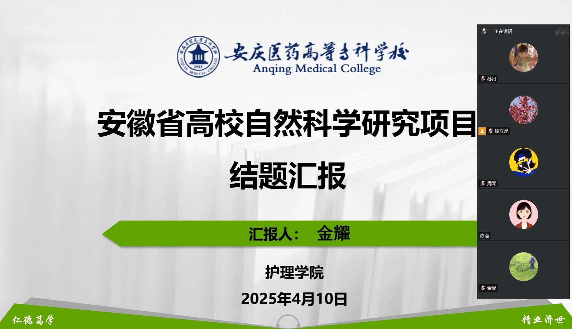 依据《校科研项目开题、中期检查及结题工作方案》,学院特邀安徽医科大学护理学院5位专家组成评审小组,由护理学院院长钱立晶主持,项目负责人及学院部分教师线上参会。
