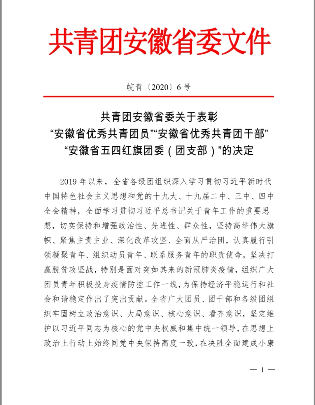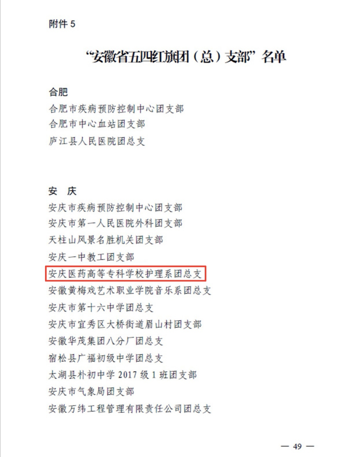 近日,共青团安徽省委印发了《共青团安徽省委关于表彰“安徽省优秀共青团员”“安徽省优秀共青团干部”“安徽省五四红旗团委(支部)”的决定》(皖青[2020]6号),授予安庆医药高等专科学校护理系团总支 “安徽省五四红旗团总支”荣誉称号,这是共青团安徽省委授予全省基层团组织的最高荣誉。
