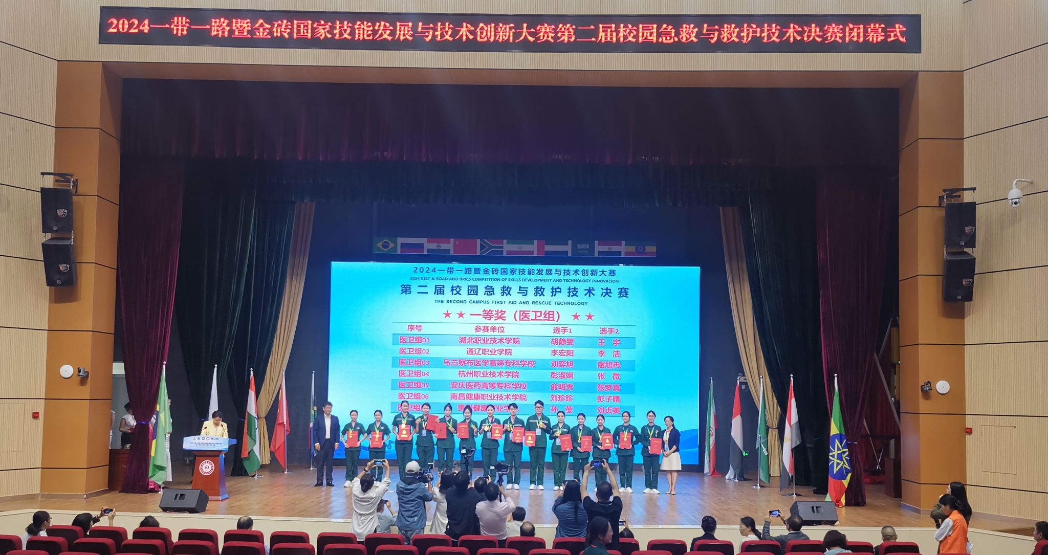 2024年10月14日,一带一路暨金砖国家技能发展与技术创新大赛第二届校园急救与救护技术决赛在湖北省孝感市圆满落下帷幕,大赛由湖北职业技术学院承办。我校护理学院俞明秀、张梦真同学荣获医卫组一等奖,是安徽省唯一的一等奖;杨飞、丁梦桃老师荣获优秀指导教师称号,学校荣获最佳组织奖。