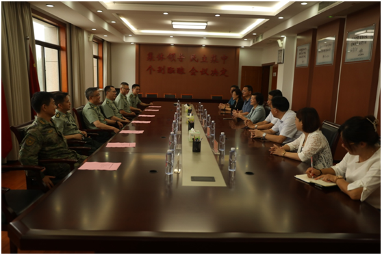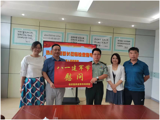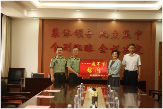 军民鱼水情,八一慰问暖人心。为进一步弘扬拥军优属、拥政爱民的光荣传统,7月29日,在“八一”建军节来临前夕,校党委书记叶林霞、校长姚文兵,副书记张仕庆、副校长朱庆丰,党委委员朱雯,党委委员陈琪等一行带着全校教职工的祝福走访慰问安庆市军分区和宜秀区人民武装部,向官兵们致以诚挚的节日祝福,共话军民鱼水深情。学生处、校征兵工作站、宣传部等相关部门同志陪同。