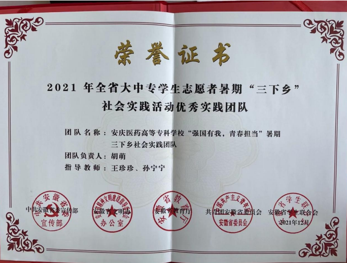 医学院荣获安徽省暑期“三下乡”优秀社会实践团队