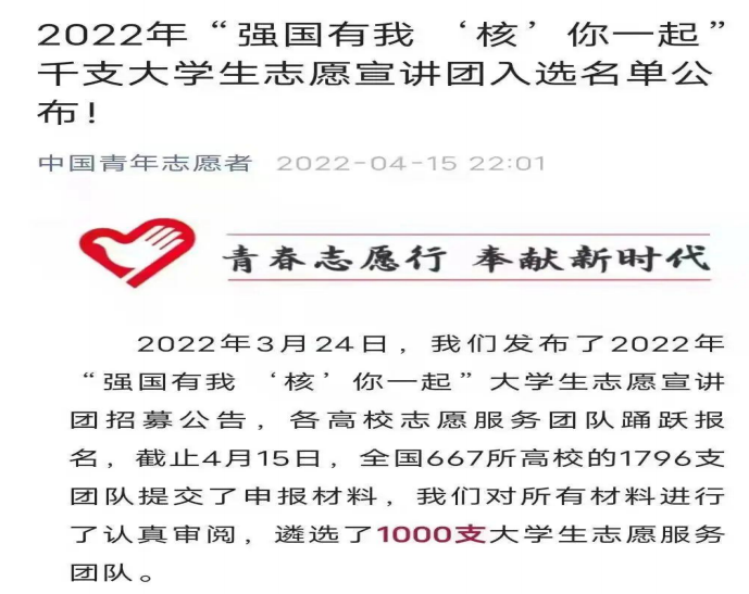 大学生“青鸽志愿宣讲队”成功入选2022年全国“强国有我“核’你一起”千支大学生宣讲团