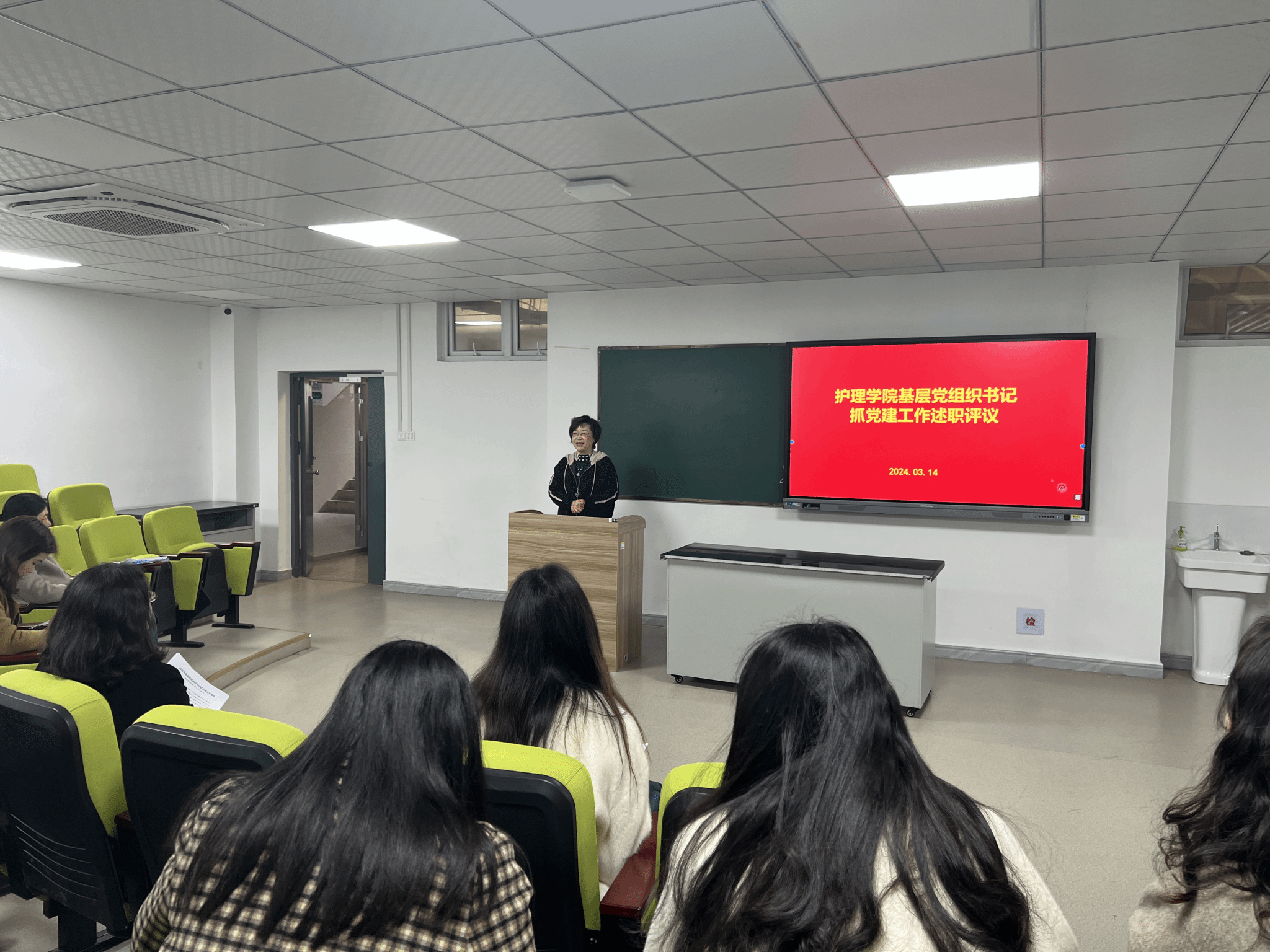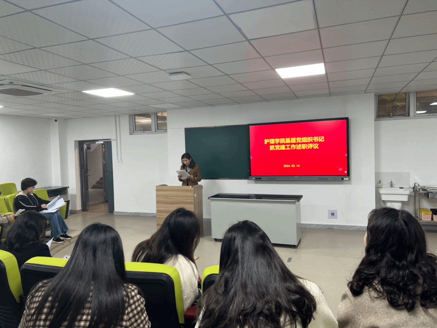 会上,内科护理党支部、外科和妇儿护理党支部、基础护理党支部、护理实训中心党支部、学生第一党支部、学生第二党支部书记依次进行述职,她们详细汇报了过去一年党建工作的开展情况,包括了思想政治教育、党员发展、组织生活等方面的工作成果,并对存在的问题进行了深入分析,提出了改进措施和未来工作计划。与会人员认真听取了述职汇报,并进行了现场评议。