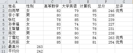 (1)筛选数据表中总分小于240及大于250的女生记录。