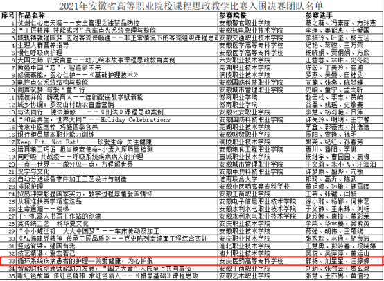 近日,安徽省教育厅主办的2021年安徽省高等职业院校课程思政教学竞赛决赛入围名单公示,我校作品入围决赛。