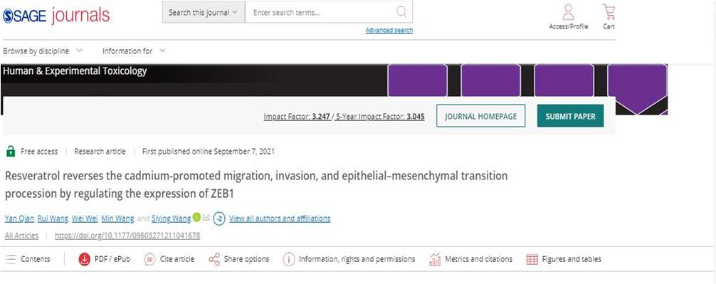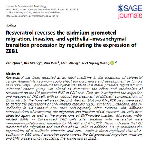 我校基础医学院钱燕副教授团队在国际期刊《Human & Experimental Toxicology》发表题为“Resveratrol reverses the cadmium-promoted migration, invasion, and epithelial–mesenchymal transition procession by regulating the expression of ZEB1”的研究论文。