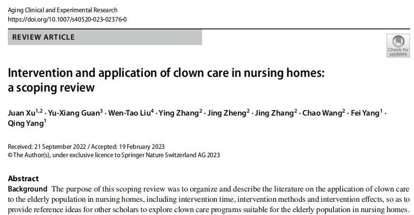 我校护理学院许娟老师在《Aging Clinical and Experimental Research》(中科院分区医学3区,IF 4.00)发表了题为《Intervention and application of clown care in nursing homes: a scoping review》的研究论文。