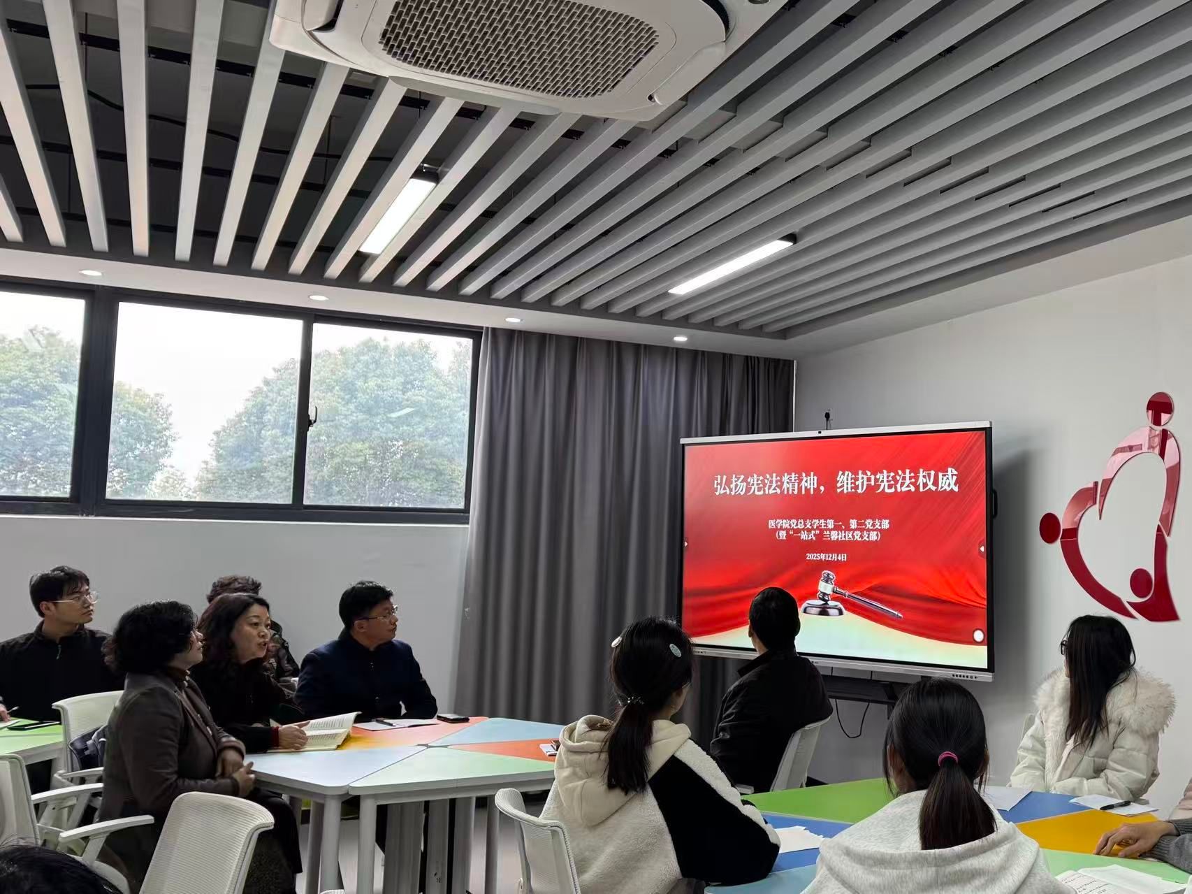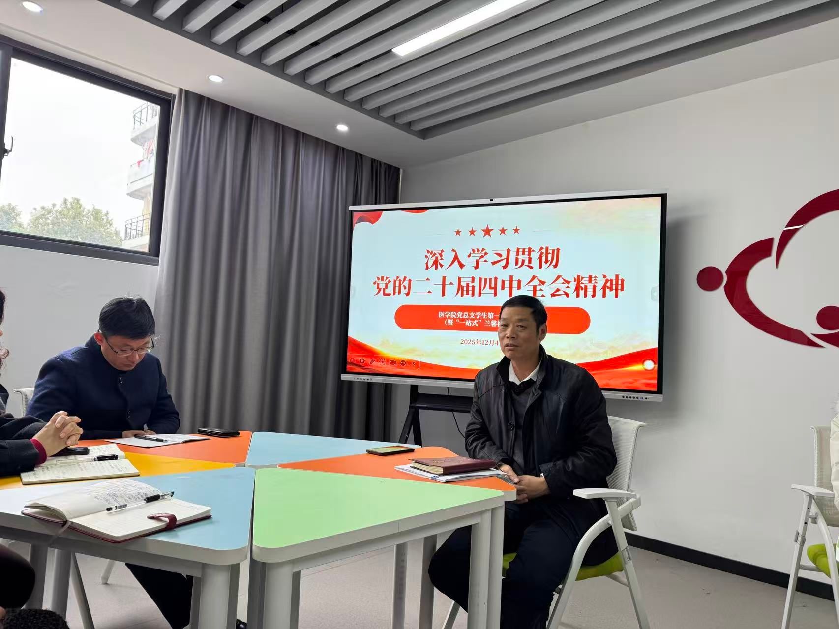 2025年12月4日,医学院党总支学生第一、二党支部(一站式社区党支部)在杏林党建开展专题党课学习会,深入学习领会党的二十届四中全会精神,并开展宪法专题学习教育。支部全体教师党员、学生党员参加学习,学院副院长张爱荣列席会议。副校长毛以成、医学院党总支书记刘燕为支部上党课。