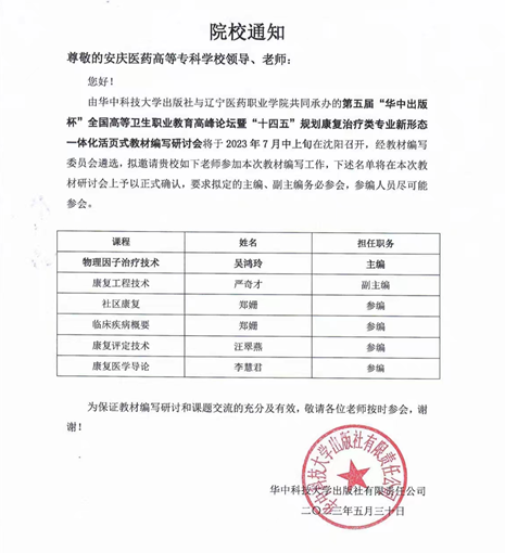 为积极贯彻《国家职业教育改革实施方案》、《“十四五”职业教育规划教材建设实施方案》、《高等学校课程思政建设指导纲要》等文件精神,落实国务院关于教材建设的决策部署,深化职业教育“三教”改革,培养适应行业企业需求的“知识、素养、能力、资格标准”四位一体的发展型实用人才,构建高职课程体系,实践“双证融合、理实一体”的人才培养模式,医学院积极组织康复治疗技术专业多位教师参加高等职业教育“十四五”规划康复治疗类专业新形态一体化活页式教材的编写工作,最终有5名康复治疗技术专任教师承担主持、参加6本活页式教材的编写工作。