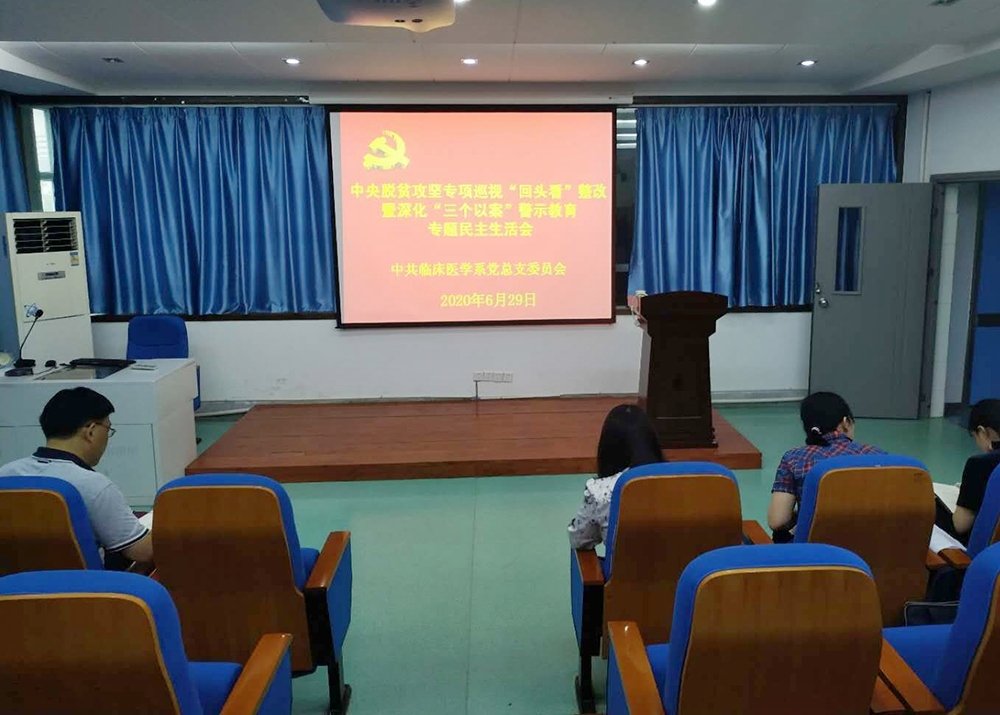 根据学校党委《关于召开中央脱贫攻坚专项巡视“回头看” 整改暨深化“三个以案”警示教育专题民主生活会和组织生活会的通知》要求,6月29日上午,临床医学系党总支在系手术观摩室召开专题民主生活会。校党委委员、副校长朱庆丰到场指导,监察审计处工作人员、总支班子成员参加,会议由总支书记陈琪主持。