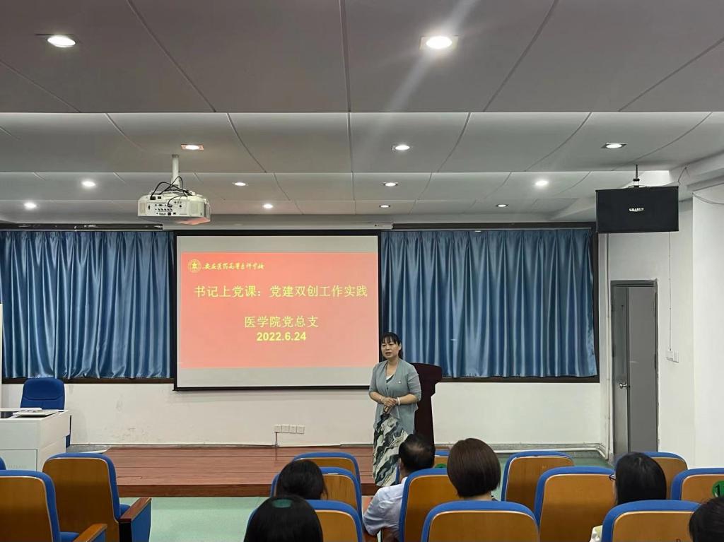 为迎接党的二十大胜利召开,庆祝建党 101 周年,不断提升党组织的号召力、凝聚力和战斗力,2022年6月24日,医学院党总支书记刘燕在外科手术观摩室为全体党员上“七一”专题党课——《党建双创工作实践》,全体党员参加。