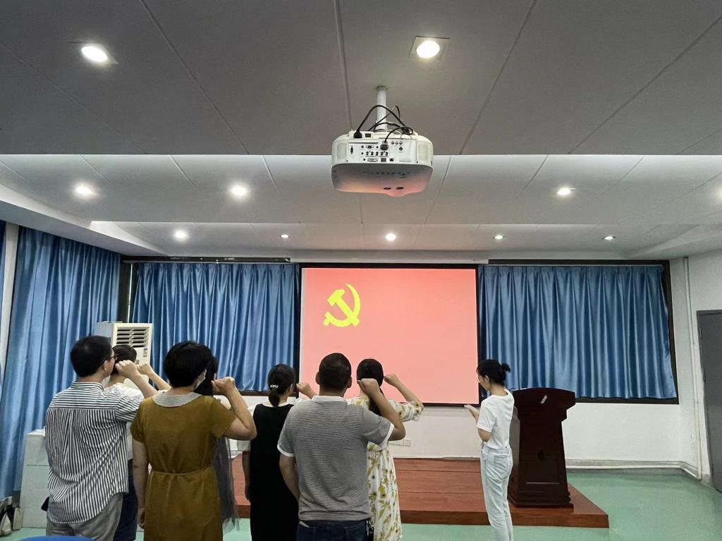 支部全体党员围绕《关于迎接党的二十大庆祝建党101 周年有关安排的通知》精神,开展集中观看“七一”红色影片和重温入党誓词活动。最后,陈梦布置近期工作任务,梳理下学期工作重点,明确工作安排。