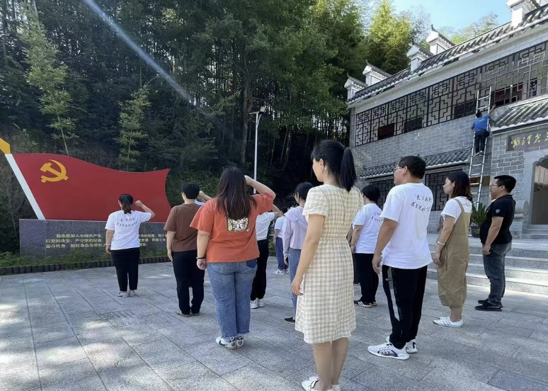 纪念馆前,党员在党旗前肃立,手握右拳宣誓,重温入党誓词,用铿锵有力的宣誓庄严承诺践行使命的信心和决心。