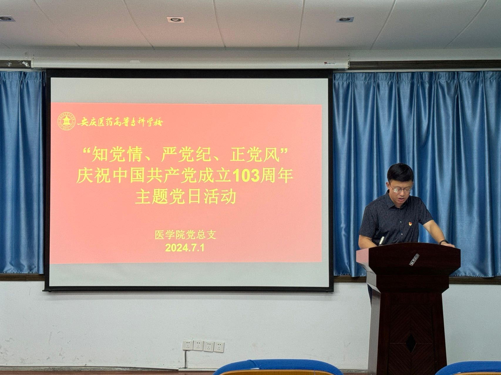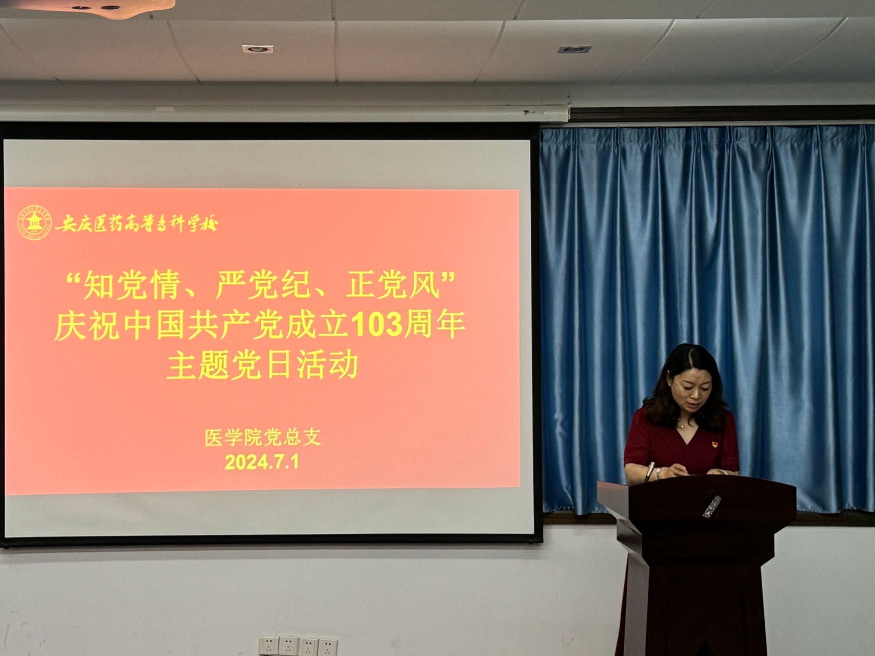 为庆祝中国共产党成立103周年,深入学习贯彻习近平新时代中国特色社会主义思想,进一步推进党纪学习教育走深走实,2024年7月1日,医学院党总支在外科手术观摩室开展“知党情、严党纪、正党风”庆祝中国共产党成立103周年主题党日活动。会议由医学院党总支书记刘燕主持。