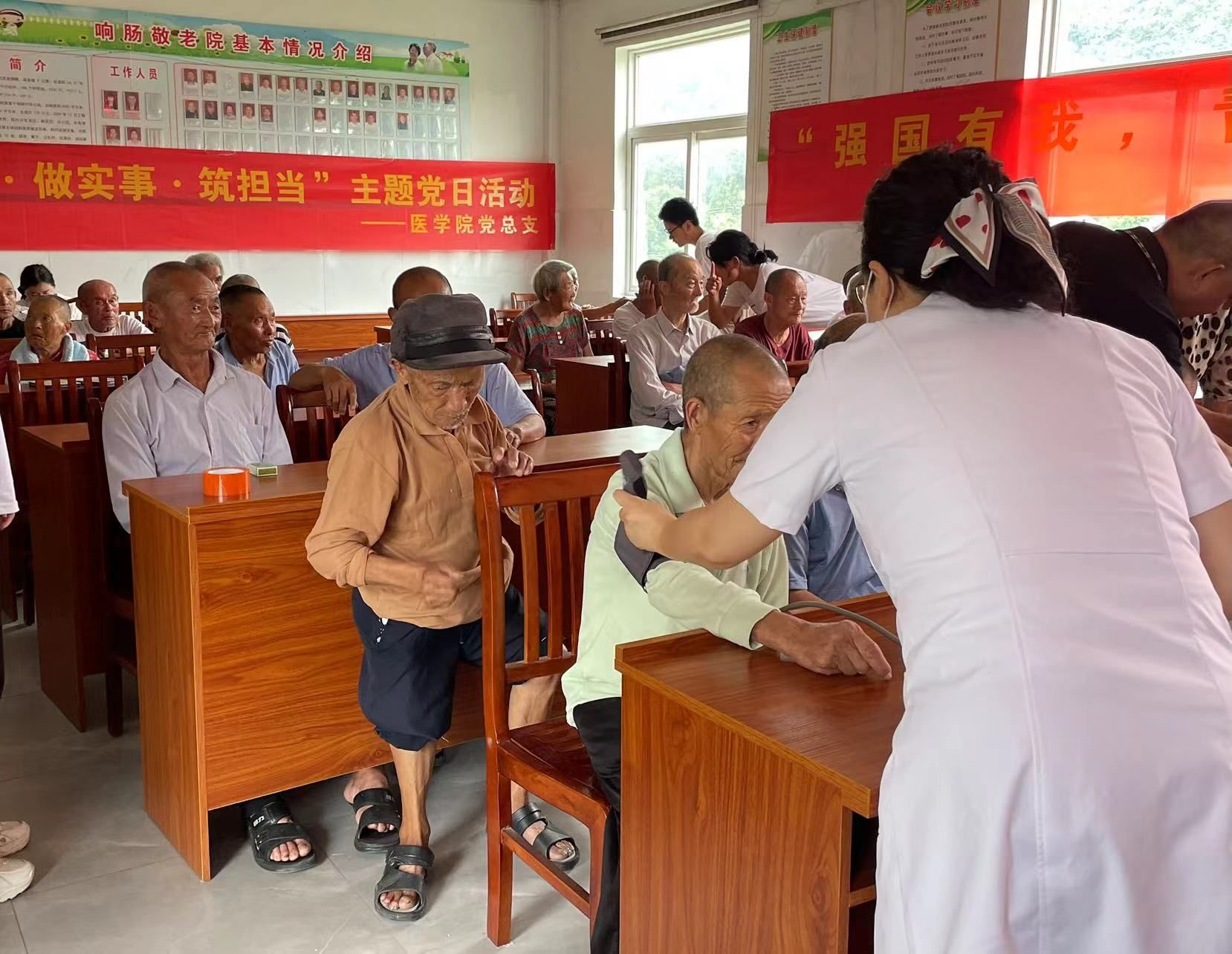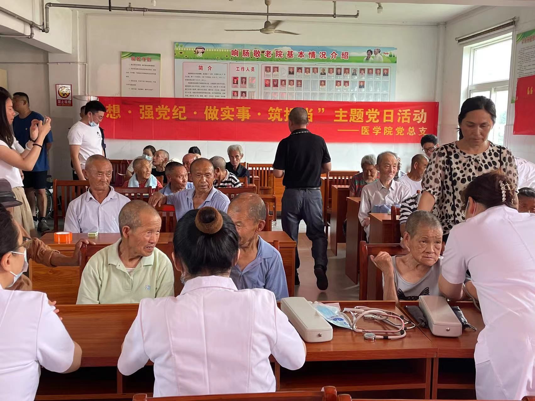 下午,医学院党总支的党员们将红色教育与实践活动相结合,前往响肠镇养老院开展义诊活动。在养老院里,党员们为老人们提供了免费的医疗咨询、血压测量、血糖检测等服务,并耐心解答老人们提出的健康问题。党员们还根据老人们的身体状况,提出了合理的饮食建议和生活指导,让老人们感受到了来自党和社会的温暖与关怀。此次义诊活动不仅展现了医学院党员们的专业素养和奉献精神,也进一步弘扬了尊老敬老的传统美德。