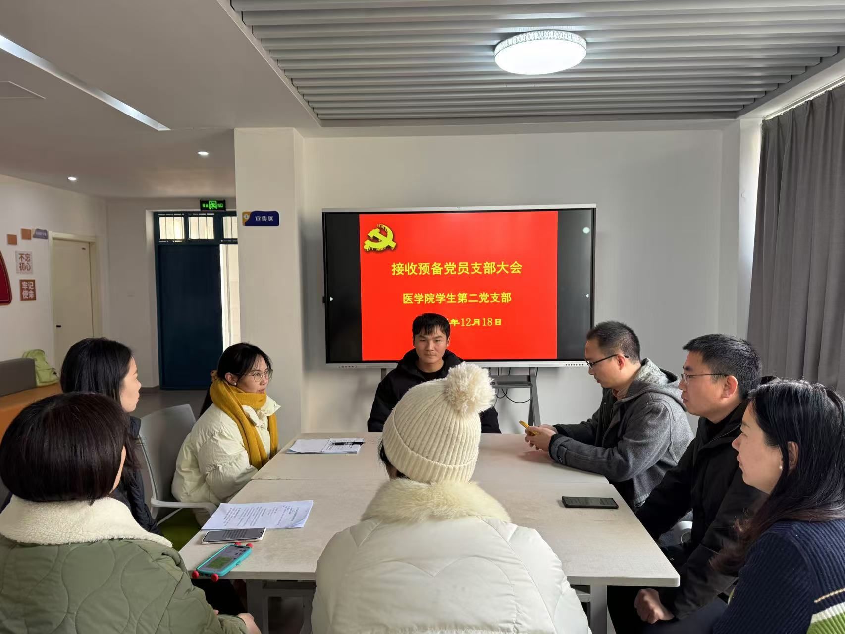 2024年12月18日,医学院党总支学生第二党支部在杏林党建召开吸收预备党员会议。大会主要讨论并决议是否吸收代蒙恩同志为预备党员。支部书记陈梦主持会议,医学院学生第二支部全体党员、拟发展对象培养老师及拟发展对象参会。