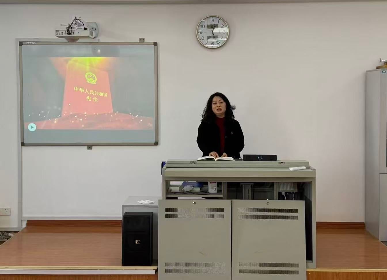 为贯彻落实学校关于开展宪法专题学习的文件精神与通知要求,深入学习宣传贯彻习近平法治思想,推动宪法深入人心,2025年12月3日中午,医学院党总支在实训楼四楼示教室召开全体党员大会,以集中学习与观看视频相结合的方式开展宪法专题学习。会议由医学院党总支书记、院长刘燕主持,总支全体党员参加。