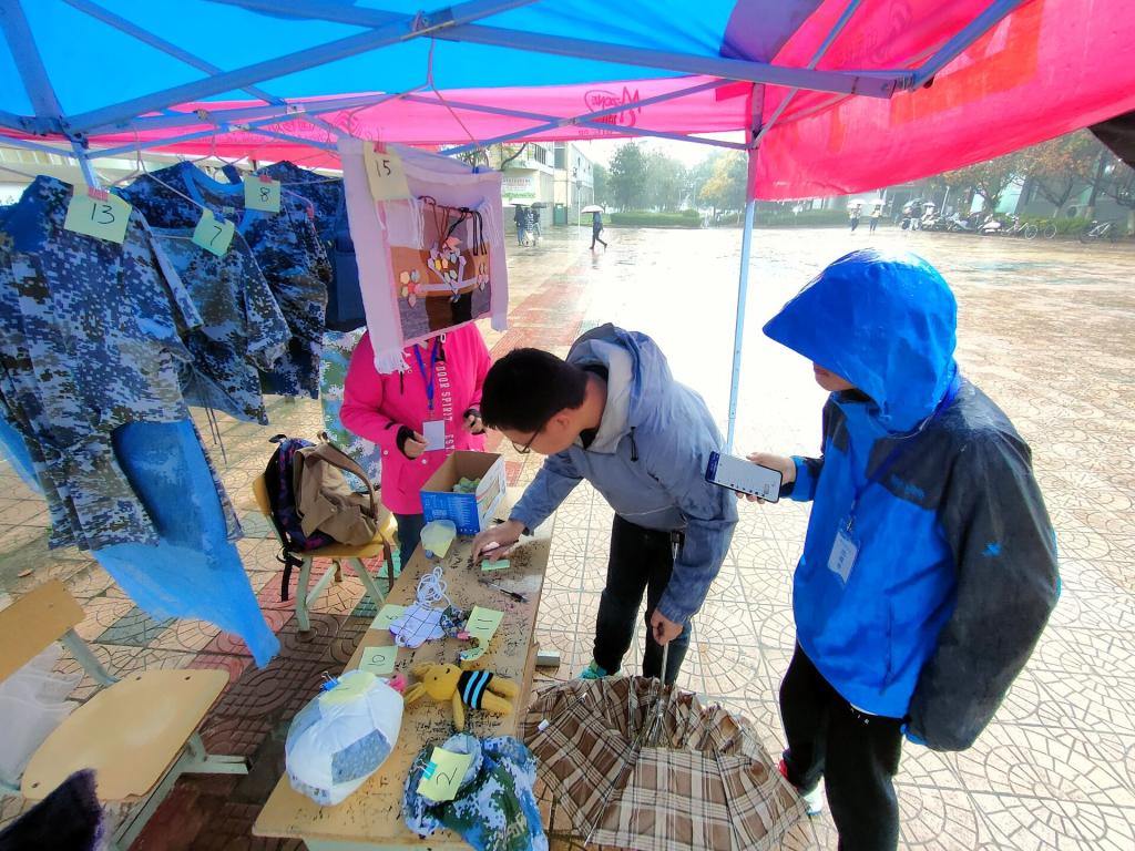 活动刚开始,同学们踊跃报名参加,参赛作品简单实用且设计巧妙。其中有21件作品脱颖而出进入决赛,并由同学们进行投票,选出最终的获奖作品,投票现场活动氛围热烈,即使下雨也浇灭不了大家的热情。没有天生的垃圾,只有放错位置的资源,一件件旧衣物在选手们的巧手下焕然一新。同学们驻足在一件件变废为宝的创意展品前,赞赏参赛选手们的创意与动手能力,并为他们心仪的作品投上宝贵的一票。