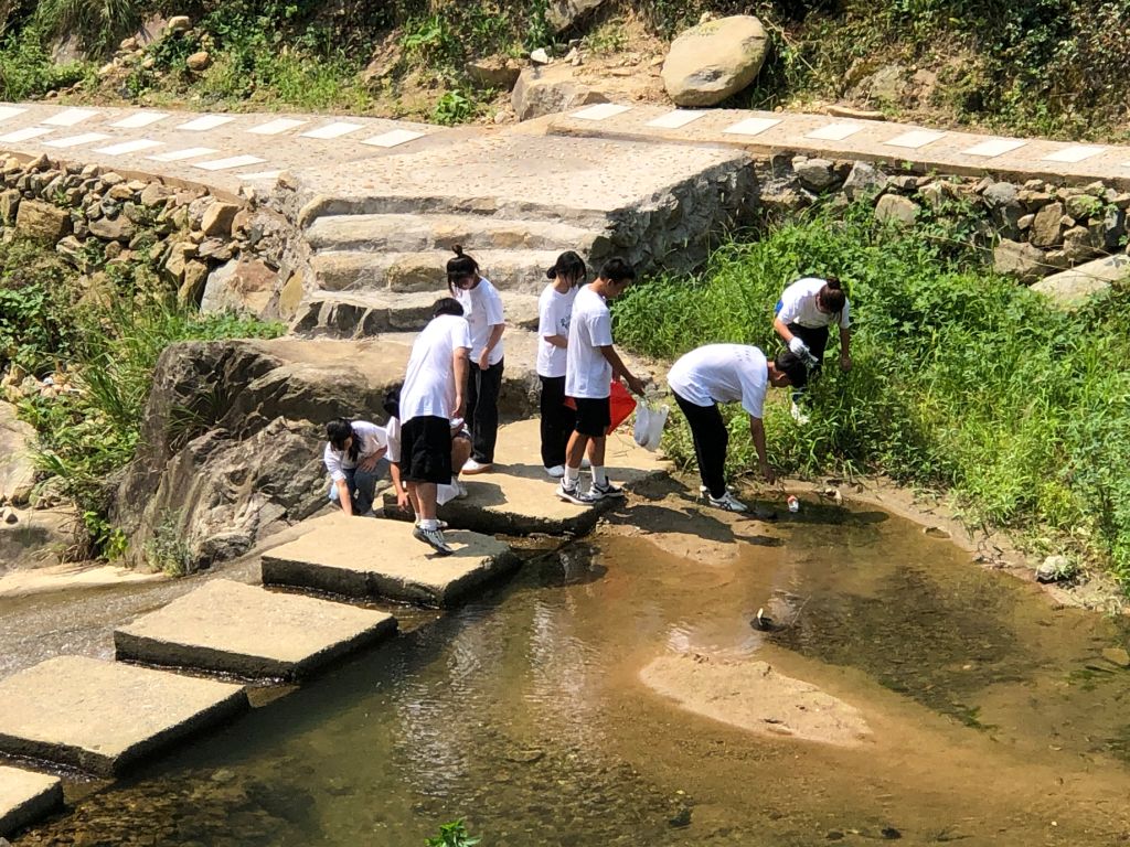 在道路下方,就是一条美丽的山间小溪,溪水拍打着岩石,浪花飞溅,在山间竹林的映照下,小溪仿佛在唱歌,歌颂新时代的美好。但是小溪河边有不少垃圾袋、塑料瓶等白色垃圾,同学们看到这些,虽汗流浃背,但还是沿着旁边的小道就径直下去了,深入小溪边,在 保障安全的情况下,将小溪边的白色垃圾、矿泉水瓶全部清理干净。看到白色垃圾清理完毕,山间小溪明净清澈,同学们都开心的笑了,全身的劳累都一散而去。