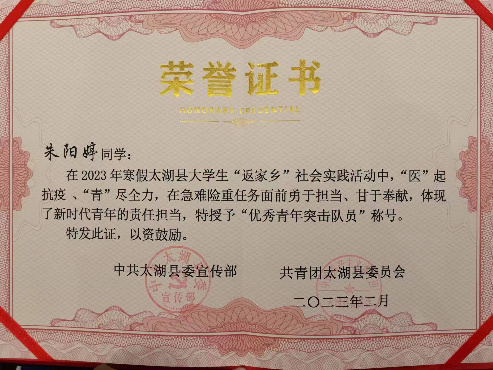 为顺利实现新冠病毒感染疫情防控平稳转段,确保全县父老乡亲能够过一个平和圆满的春节,寒假期间太湖县团县委发起了专业型青年突击队急招募志愿者活动。作为医学生,我义不容辞要承担起社会所需的重担,义无反顾地加入了青年志愿者的队列!