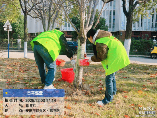 从弯腰拾捡垃圾到合力规整车辆,从细致清扫落叶到为树木涂白防寒,同学们在实践中学习了树木养护、环境整理等实用技能,体会到协作劳动的价值,增强了爱护校园、服务集体的意识。物业与安保人员的专业指导,也让同学们对校园绿化与管理有了更深入地了解。