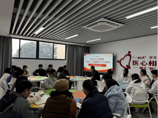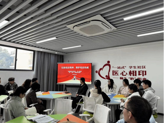 12月4日,国家宪法日当天,医学院团总支在杏林党建“一站式”学生社区,成功举办了宪法日专题学习和二十届四中全会精神专题学习活动。活动特别邀请副校长毛以成、医学院党总支书记刘燕、党总支副书记王华庆、副院长张爱荣出席本次活动,医学院学生第一、第二党支部全体党员、学院各学生组织团学干部参加本次活动。