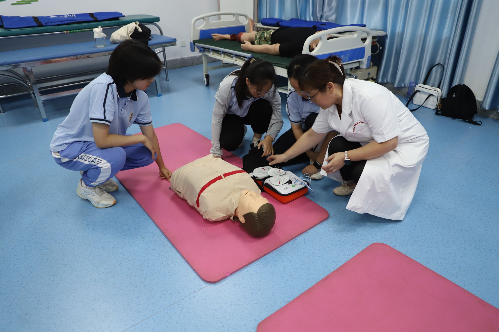 吴娟老师首先为学生们进行了急救常识的生动讲解,并利用模拟案例和现场操作,演示了心肺复苏术的关键步骤,最后对同学老师进行分组练习、随堂指导。刘燕和杨敏两位老师在授课过程中作为实验老师给予了各小组精准辅导,使学生们能够更好地理解和掌握心肺复苏术的技巧。