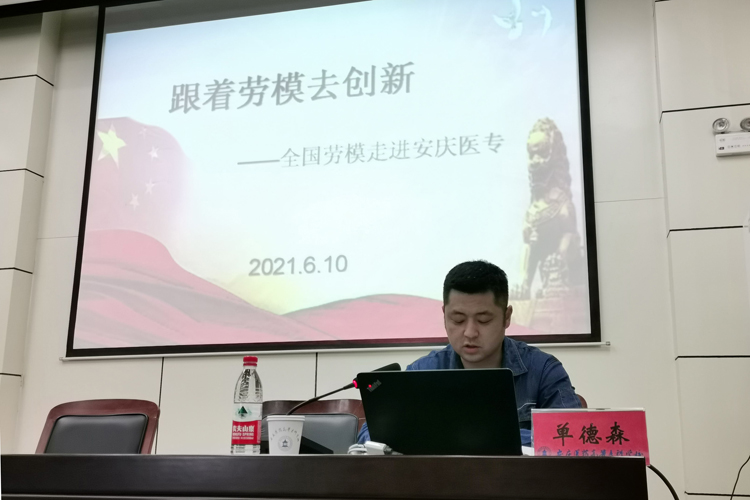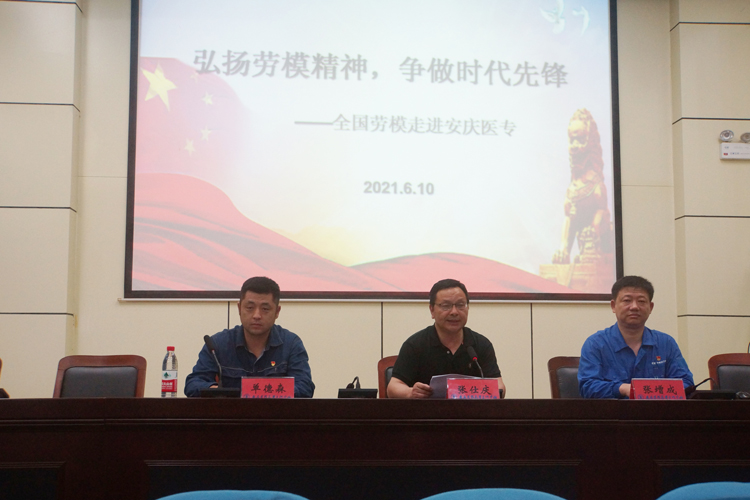 为大力弘扬劳模精神、劳动精神、工匠精神,激励学生崇尚先进、学习先进、争当先进,争做德智体美劳全面发展的社会主义建设者和接班人,6月10日下午,马克思主义学院邀请了全国劳动模范单德森、张增成在图书馆一楼学术报告厅作专题报告。报告会由校党委副书记张仕庆主持,马克思主义学院全体教师、部分辅导员和学生代表近200人聆听了报告。