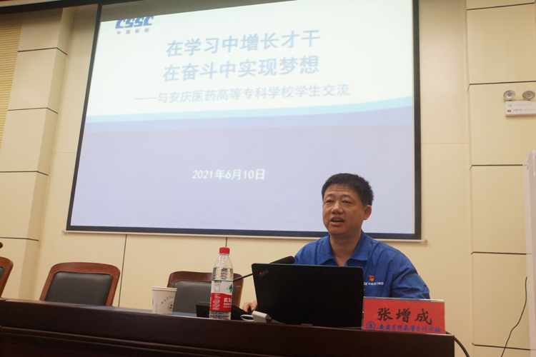 张增成是安庆中船柴油机有限公司首席技师,维修电工特级技师,高级工程师,曾获得“全国劳动模范”、“全国技术能手”、安徽省技术领军人才、“中国船舶集团技能带头人”、中船贡献奖等多项荣誉称号,是国家级“张增成技能大师工作室”领衔人。张增成结合人生经历,用自身事例向学生们讲述了坚持、传承、创新、奉献的意义。在工作中,他不骄不躁,立足本职岗位,认真学习,钻研业务,苦练本领,辛勤工作,取得了令人赞许的成绩。“一枝独秀不是春,个人的能力总是有限,大家好才是真的好。”张增成主动传、帮、带,将多年积累的技术知识和工作经验毫无保留地传授给年轻员工,培养了一批批数控设备维修技能型人才。在报告会上,他勉励青年学生们要始终牢记习近平总书记的谆谆教诲:“要肩负历史使命,坚定前进信心,立大志、明大德、成大才、担大任,努力成为堪当民族复兴重任的时代新人,让青春在为祖国、为民族、为人民、为人类的不懈奋斗中绽放绚丽之花。”