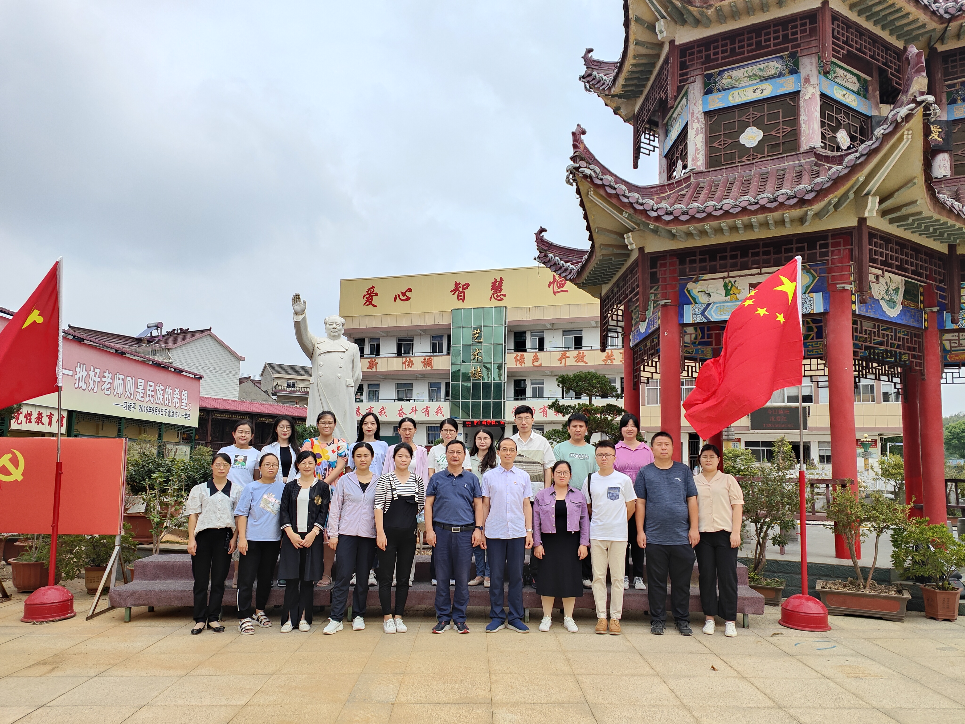 “进校莫忘父母恩,读书牢记报国情”,随着大门两侧的一行文字映入眼帘,马克思主义学院全体党员来到了考察学习的第一站——望江县文凯学校。在文凯学校负责人的热情陪同和热心讲解下,大家依次参观了学校的红色阅览室、党性教育馆、智慧党建室、四史长廊、毛泽东像章收藏室和校内道德建筑群等。参观结束后,大家来到毛泽东主席塑像前,面对党旗,举起右手,握紧拳头,庄严宣誓,重温入党誓词,回顾入党初心。随后,双方就学校党建工作、特色活动开展情况等进行了深入座谈。通过参观、交流,大家真切感受到了文凯学校在“党建引领发展,实干提升质量”“真心办学校,情感育英才”“红色文凯、爱心校园、特长发展”的工作理念指导下所取得的实实在在的成效。