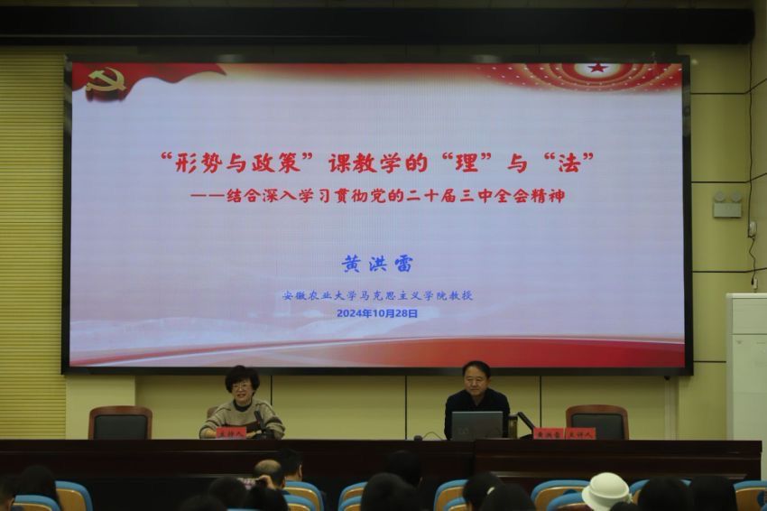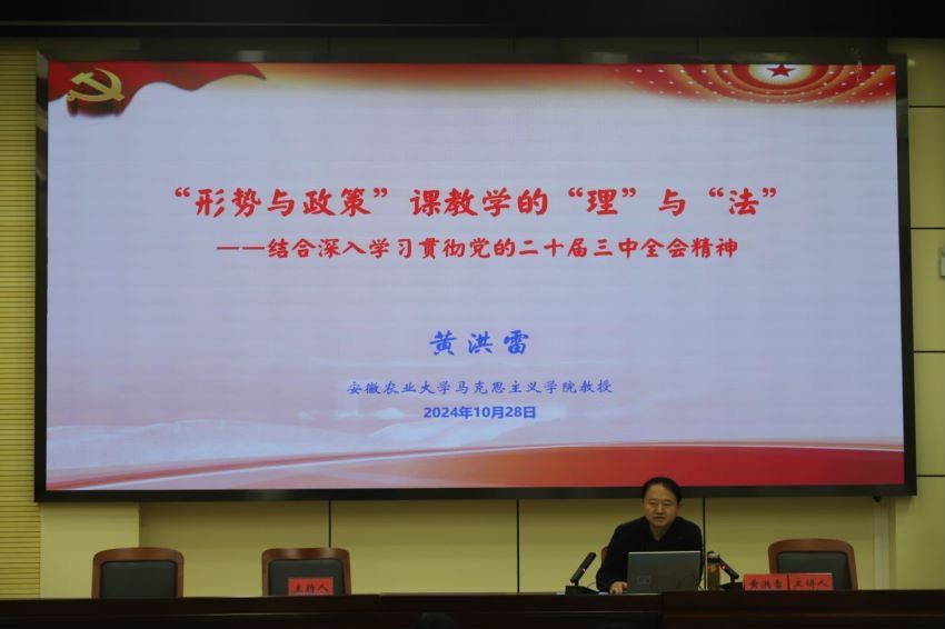 10月28日,在全校上下掀起学习习近平总书记在安徽考察时的重要讲话精神的热潮之际,安徽农业大学党委委员、马克思主义学院教授黄洪雷应邀来到我校,以“形势与政策”课教学的“理”与“法”——结合深入学习贯彻党的二十届三中全会精神为题,为全校师生作专题报告。校党委副书记张仕庆,校党委委员、药学院党总支书记、院长刘毅出席,部分党务干部、专职思政课教师、学生思政委员、青马班学员近200人聆听报告。专题报告会由校党委委员、宣传部部长朱雯主持。
