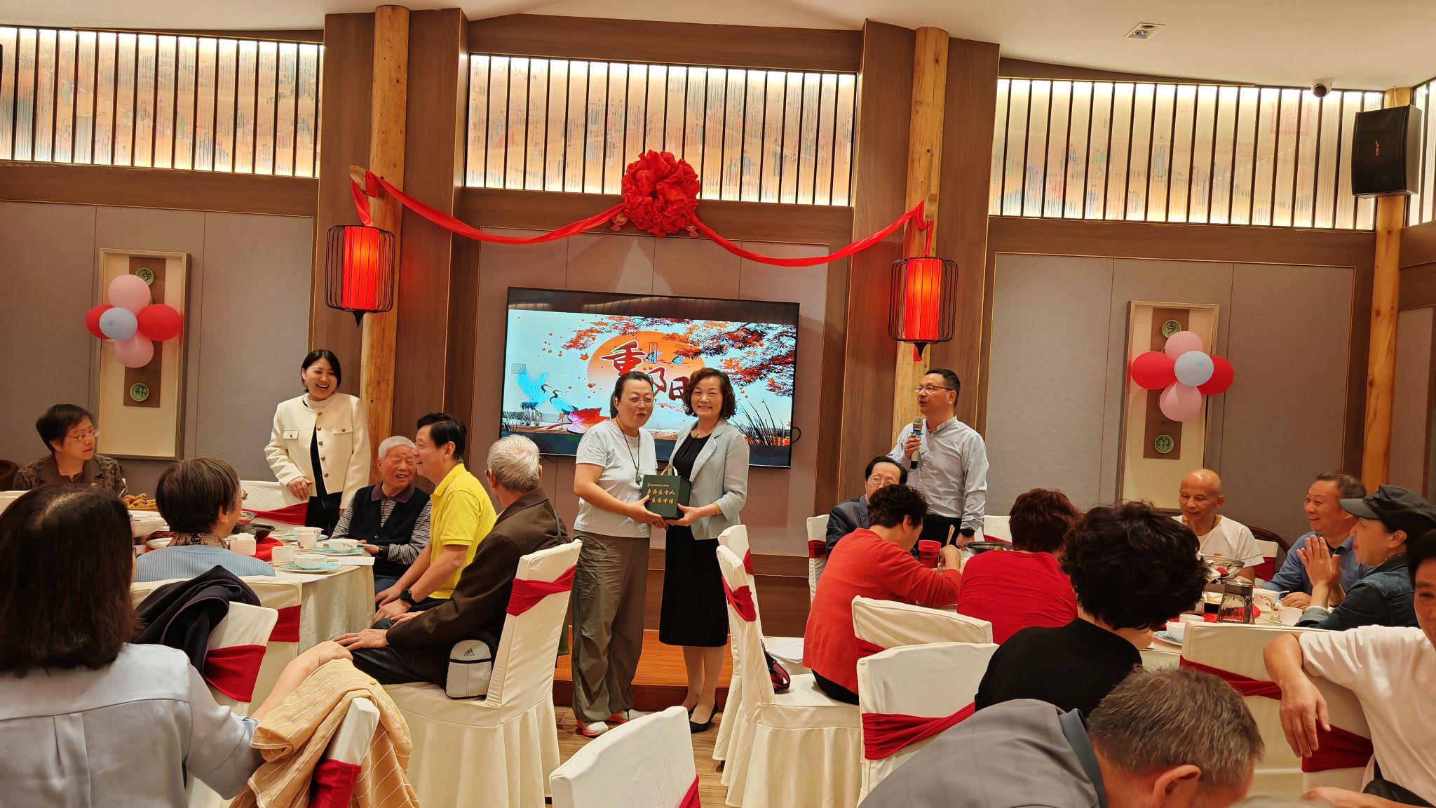 叶林霞向离退休老领导、老同志们致以诚挚的节日祝福和问候,并为2024年荣誉退休的教师代表颁发荣退纪念品。老同志们的如花笑靥和饱满精神使她倍感亲切和欣喜,她祝愿老同志们重阳节快乐,幸福安康,平安顺遂,年年有今日、岁岁有今朝!
