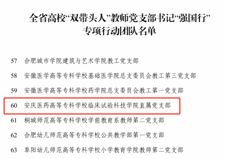 近日,中共安徽省委教育工作委员会公布了全省高校“双带头人”教师党支部书记“强国行”专项行动团队名单,我校临床试验科技学院直属党支部成功入选,实现学校党建示范创建和质量创优工作新突破。